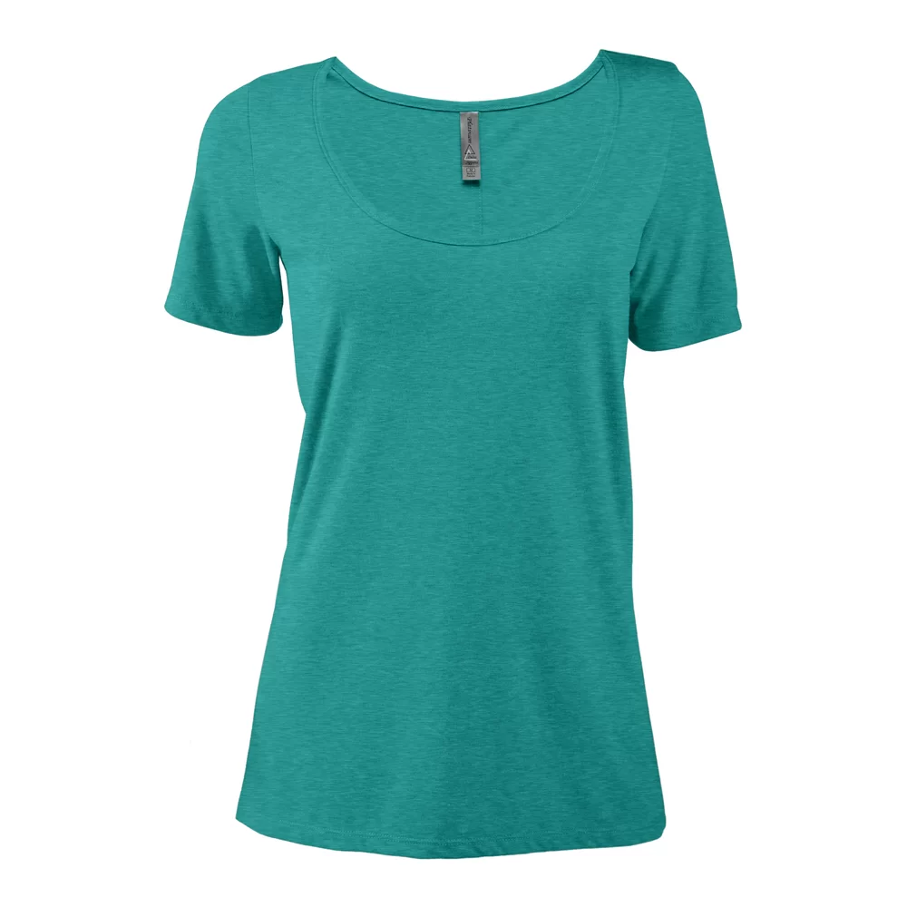 Information:A classic Scoop Neck tee Fit Our sizes are labeled for Juniors for a snug fit; size up for a looser fit Features Scoop neck and seamed womens silhouette Decorative center back seam Short sleeve and self bound collar Sizes S-2X Fabric 4.3 oz. Butter soft Tri-blend fabric 50% Polyester/25% Combed Ringspun Cotton/ 25% Rayon Style Number SKU:P504TS