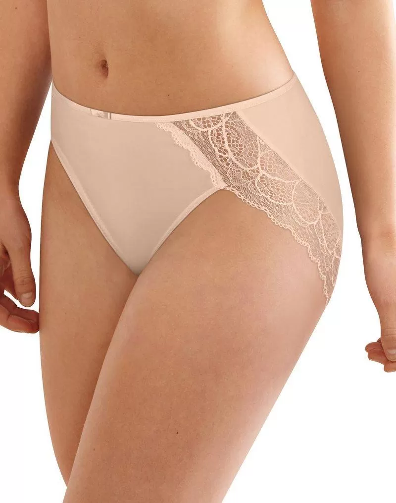 Luxurious lace and satin trim create the Lace Desire collection. Feel beautiful every day. This hi-cut brief combines trusted Bali fit with lovely transparent lace. Full back coverage with lace insets at legs. No ride-up comfort. Ultra-soft microfiber and lay-flat lace feel silky smooth against your skin for a no-lines look that disappears under clothes. Ultra-soft covered waistband for all-around comfort. Cotton crotch. Look for matching Lace Desire bras.