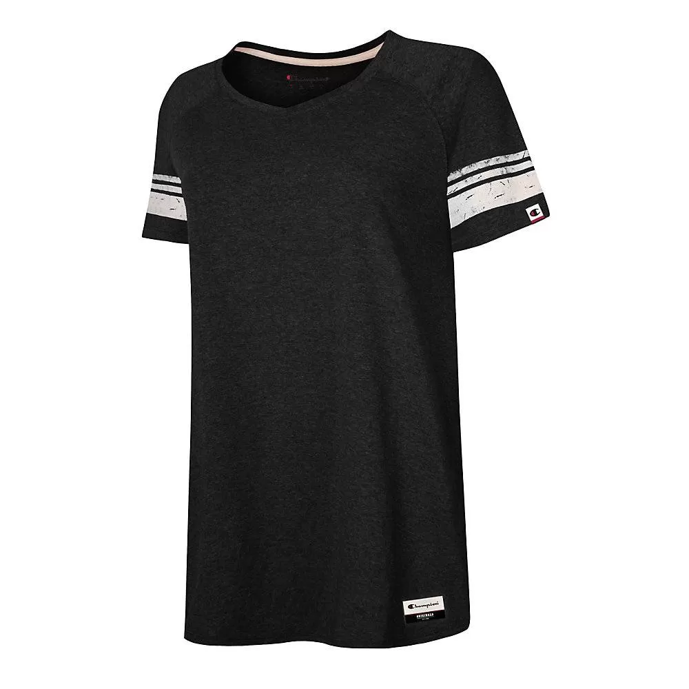 Information:Champion Authentic Originals Women's Triblend Short Sleeve Varsity Tshirt 4.3 oz. 60% polyester/30% cotton/10% rayon jersey.Why try a triblend? For the luxurious super softness.Vintage-look distressed varsity stripes on sleeves.Tag-free V-neck has twill back neck taping.Scooped shirt-tail hem adds style.Reinforced stitching at hem for durability.Champion "C" logo and Champion jock tag.Machine wash cold with like colors, inside out if decorated. Use only non-chlorine bleach when needed. Tumble dry low. Cool iron if needed. Do not iron decoration.