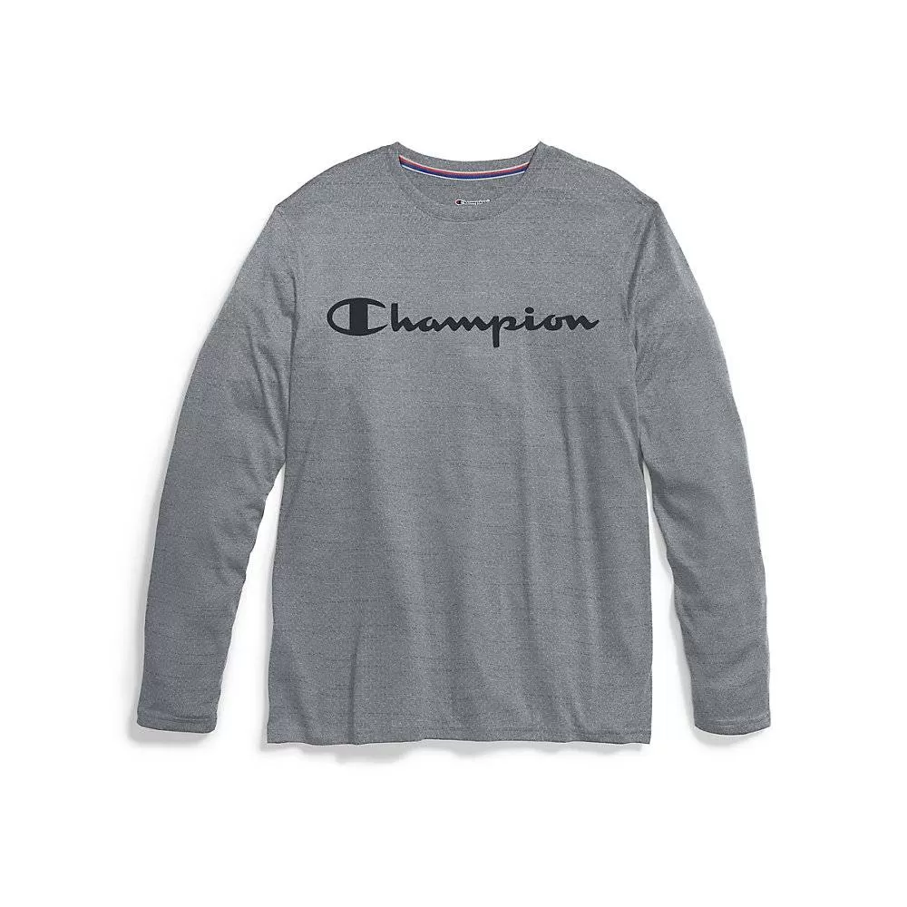 Information:Whether you run hot or cold, our Double Dry® Long-Sleeve Tee keeps you drier and cooler.Double Dry technology wicks sweat and quickly evaporates moisture.FreshIQ® advanced odor protection technology helps tee resist odor.Flatlock seams guard against chafing.Lightweight, super-soft heather fabric moves with you.Signature stripe back neck tape prevents irritation.12-inch screenprint Champion logo center chest.