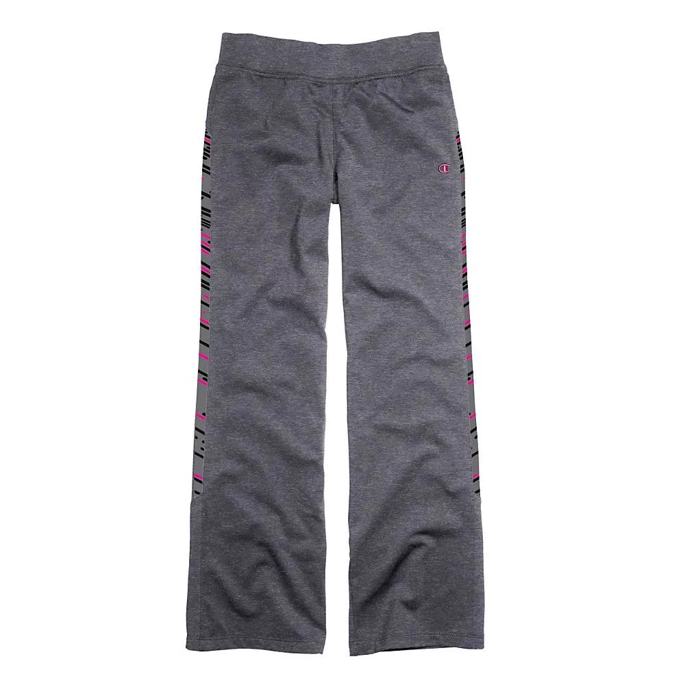 Lightweight polyester tech fleece pants make perfect warm-ups or school pants. Champion Authentic quality. Poly Tech Fleece is warm but not bulky, perfect for running and playing. Printed pierced side inserts add a flash of style. Seams across hips and calves in back. Embroidered left hip C logo. Rib waist with no drawstring for safety. Open leg bottoms.