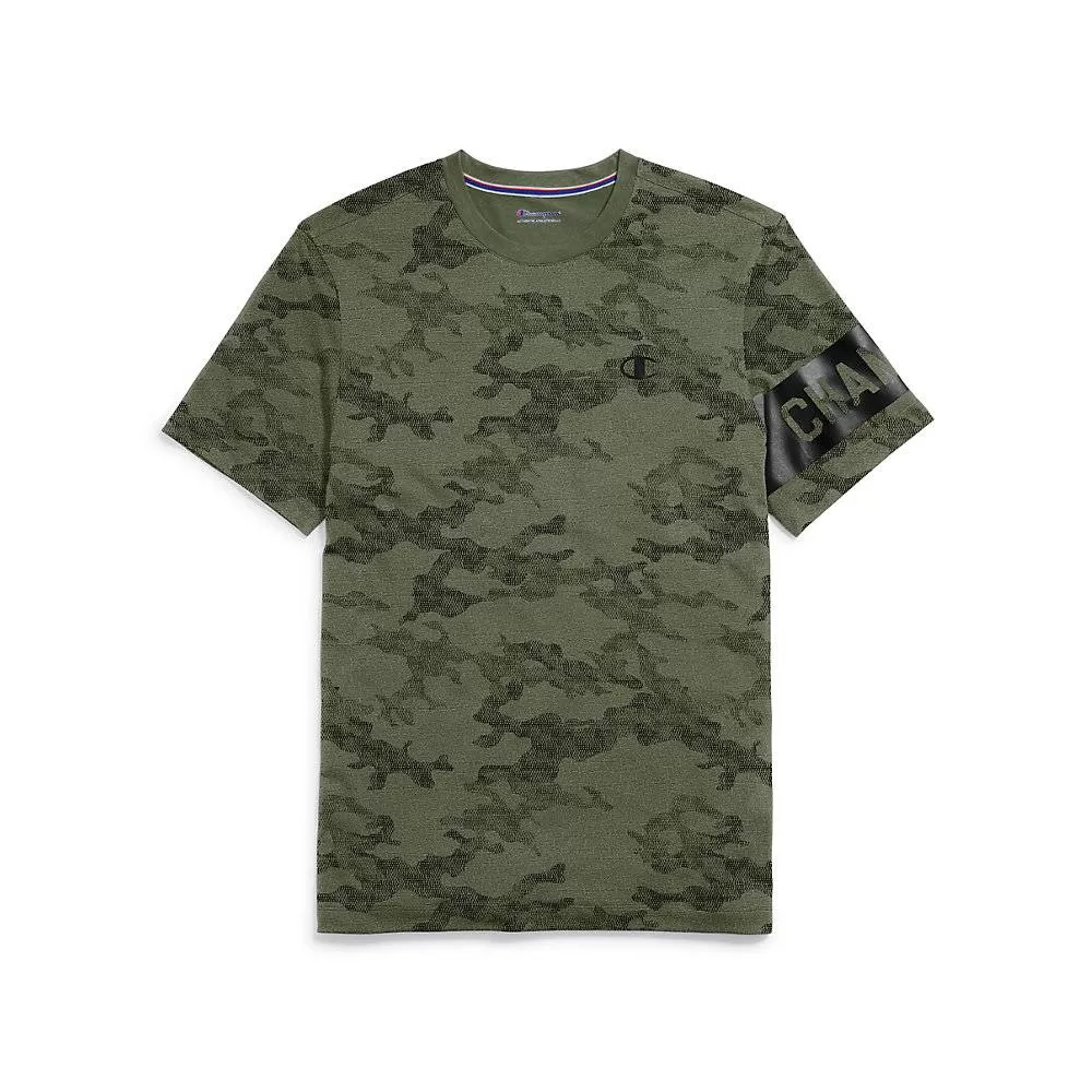 Information:Sport Tee has a modern fit and on-trend camo print.Soft tee with a cottony feel and plenty of stretch.Double Dry technology wicks moisture away for cooler comfort.Modern, closer-to-the body fit.Soft heritage stripe back neck tape.Split droptail hem for ease.Block screenprint Champion logo left sleeve. C patch logo left chest.