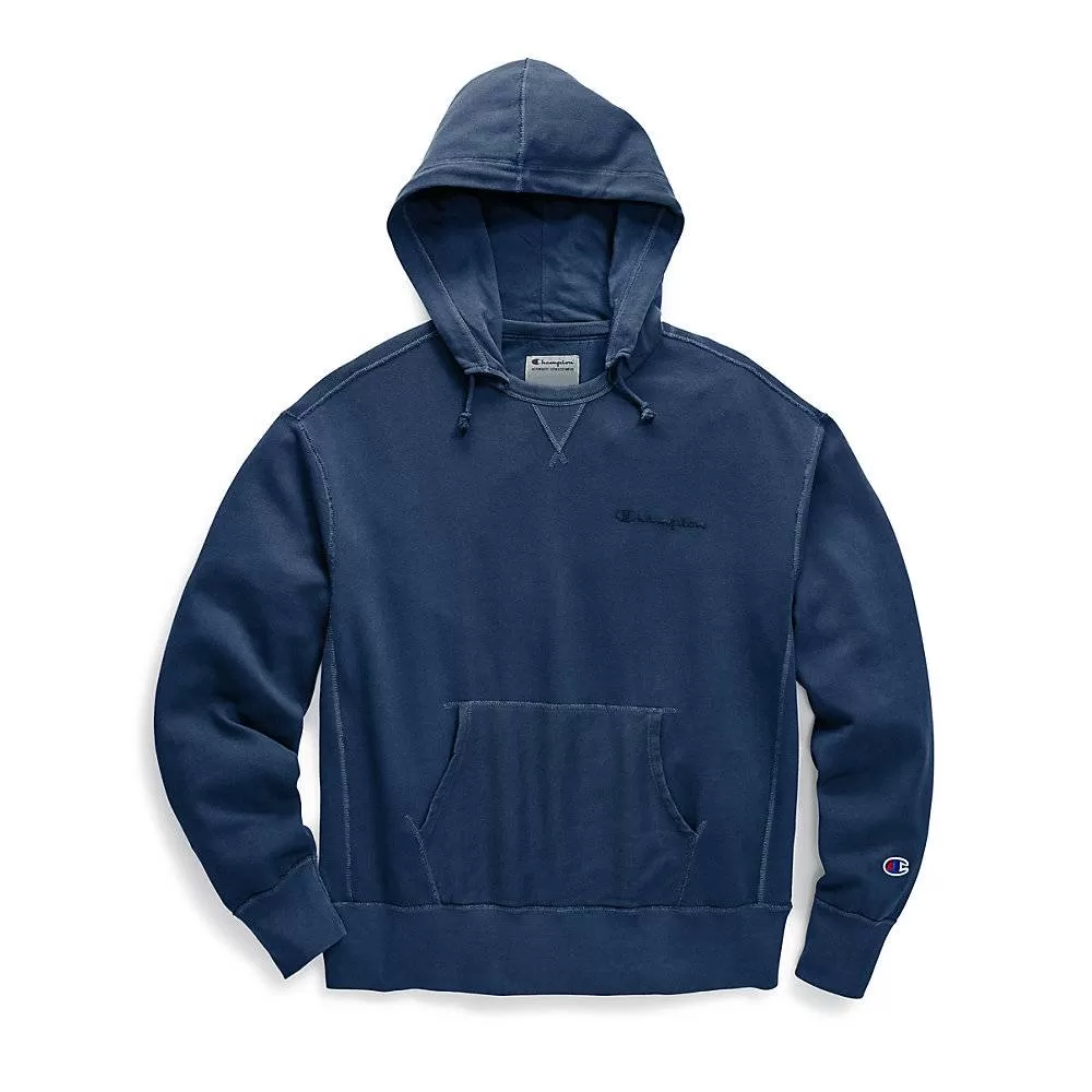 Information:Old school Pullover Hoodie pays homage to The Original Hoodie. A classic from the archives, this version is reminiscent of our first hoodie with its stitched-on hood and pouch pocket for more warmth on the sidelines during chilly practices. It's garment-dyed for rich color and a soft, broken-in feel. An extra wash process makes our cotton-rich fleece even softer. Jersey-lined hood with vintage rib trim, knotted drawcord and v-notch detail for a heritage look. Hand-warming front kanga pocket. Ribbed cuffs and waistband. Garment-dyed, embroidered Champion logo at left chest. C logo patch at cuff. Please note that due to the garment-dye process, slight variations in color may occur.