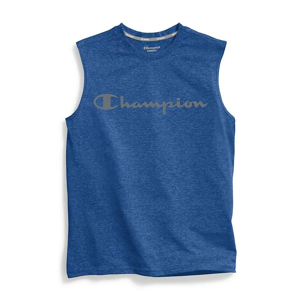 Information:Up your game with this quick drying Muscle Tee designed to keep you cool and comfortable. Champion Vapor technology wicks sweat and quickly evaporates moisture. FreshIQ advanced odor protection technology helps tee resist odor. No-chafe coverstitch seams. Lightweight, super-soft heather fabric moves with you, not against you. Â Reflective details. Champion Script graphic front chest.