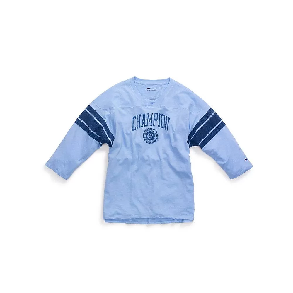 Information:The classic Football Tee with Champion graphics and a vintage feel. Cotton-rich tee is garment-washed for broken-in softness. Raglan sleeves and a relaxed fit for ease. Traditional jersey V-neck and 3/4 length sleeves with stripes. Signature stripe detail at shoulder. Double-needle finish on sleeves and hem. Retro collegiate crest and Champion logo front and center. C logo on cuff.