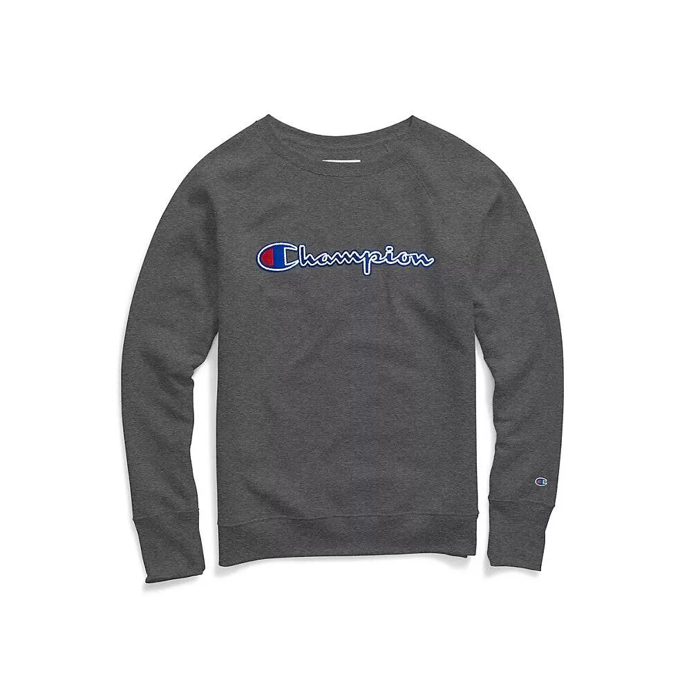 Information:Powerblend® Boyfriend Crew already has the relaxed look you love, plus elevated graphics.Slightly boxy fit with an open neckline for easy layering.Designed for less shrinkage so the fit stays true.Soft polyester/cotton fleece resists pilling and feels soft against skin.Coverstitched vintage V-notch at neck.Exaggerated ribbed cuffs and low-profile bottom band for a feminine fit.Felt Champion applique with chainstitch detail. C logo at cuff.