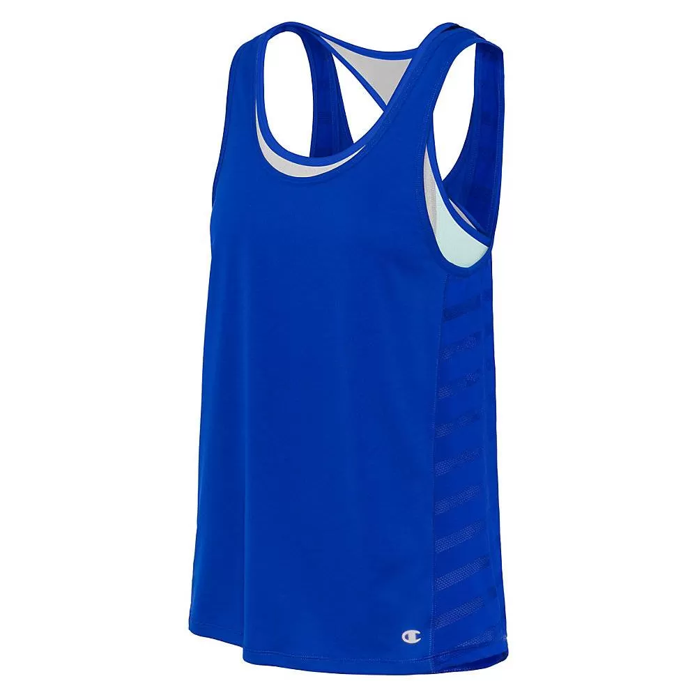 Information:Double-duty Tank with inner bra keeps you cooler wherever your training takes you. Built-in racerback bra with keyhole back and soft stripe band helps support. Semi-fit tank with tonal stripe mesh back for targeted ventilation. Double Dry® technology wicks moisture for cooler comfort. All-over stretch provides free-moving ease. C logo at hem.