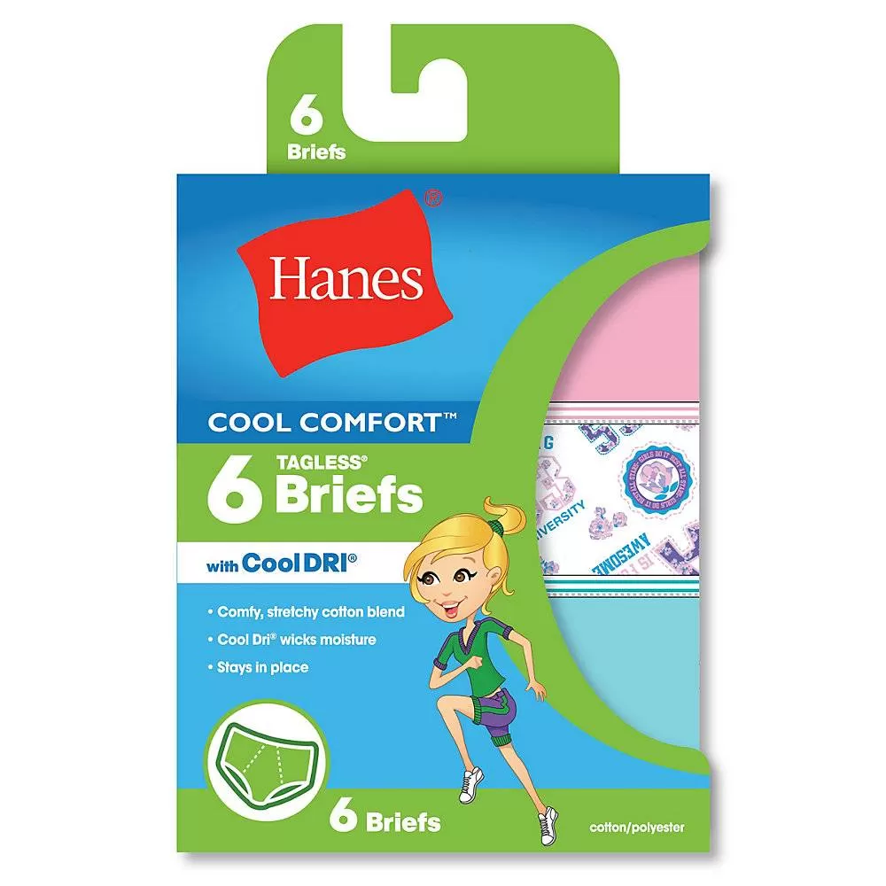 Information:Sporty styling and Cool Dri® technology keeps your little athlete on the move in comfort. Breathable and soft ComfortBlend® cotton. Cool Dri® technology wicks away moisture to keep her cool and dry. Comfort Flex® sporty waistband for added comfort.No ride up comfort.Tag-free for itch-free comfort. Brief styling sits at the waist.Assorted colors and prints available in a convenient 6-pack.