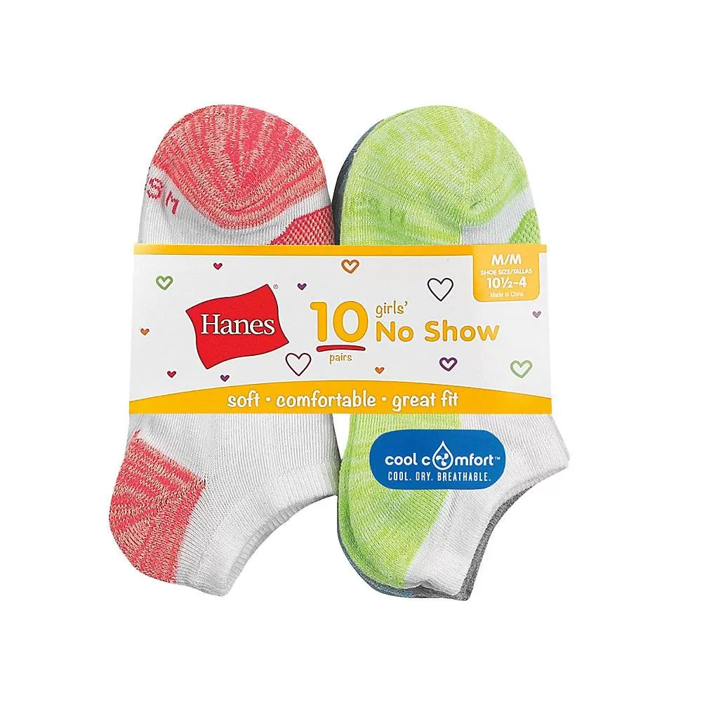 Information:These socks were made for girls on the go!Soft cotton blend fabric for all day comfort.Moisture wicking fabric keeps feet cool and dry. Hint of spandex gives socks the perfect amount of stretch for a better fit.Breathable mesh panels for added ventilation.No show socks line the shoe with minimal visability.Assorted color heels and toes.Cushioned heel and toe for added comfort. EZ Sort® sock matching system with the Hanes logo on the toes makes sorting socks so much easier! Available in a convenient 10-pack.