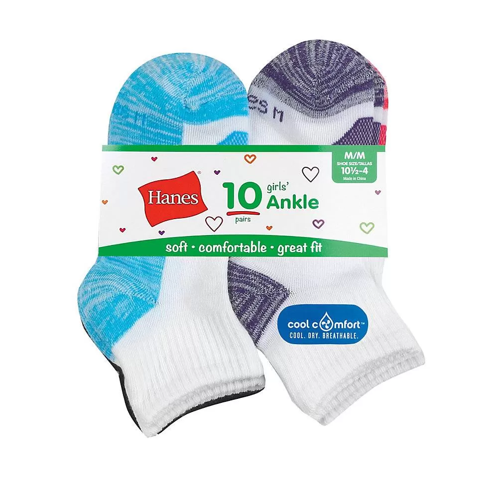 Information:These socks were made for girls on the go!Soft cotton blend fabric for all day comfort.Moisture wicking fabric keeps feet cool and dry. Hint of spandex gives socks the perfect amount of stretch for a better fit.Breathable mesh panels for added ventilation.Ankle length sits just above the ankle.Assorted color heels and toes.Cushioned heel and toe for added comfort. EZ Sort® sock matching system with the Hanes logo on the toes makes sorting socks so much easier! Available in a convenient 10-pack.