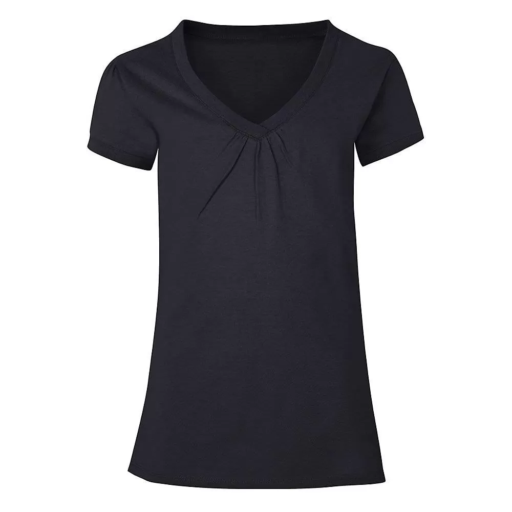 Information:Give her comfort and style in this fashion-forward V-neck tee.100% cotton jersey feels nice against the skin.Cap sleeve.Shirring detail at neck.Tag-free for itch-free comfort.