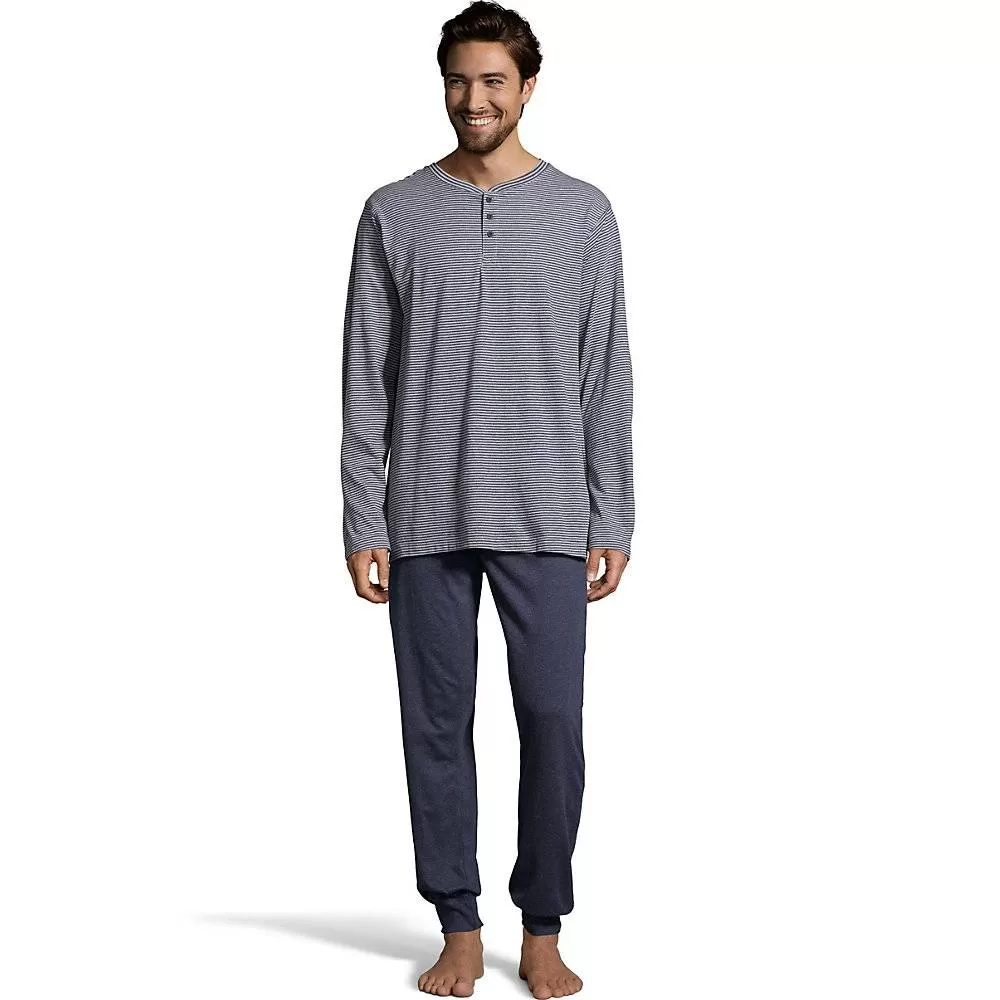 Home Bottoms Pajamas Hanes Men's 1901 Heritage Striped Henley Crewneck and Jogger Pant Lounge Set