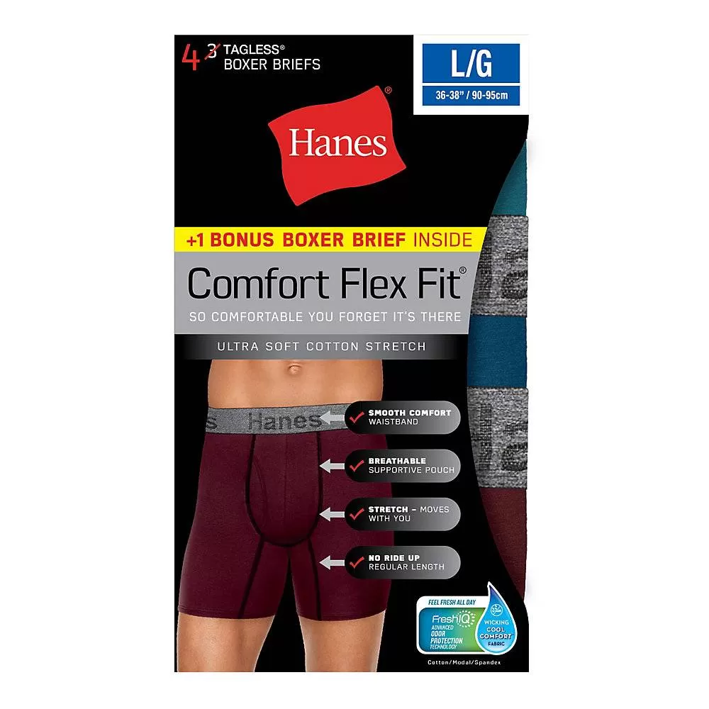 Information:FreshIQ™ advanced odor protection technology attacks the odor-causing bacteria in your clothing that causes your underwear and socks to smell — so now you can feel fresh all day. Made with ultra soft cotton stretch for all day comfort.Comfort Flex Fit® stretchable fabric moves with you.Specially designed breathable pouch gives you the support of a brief.Cool Comfort™ wicking fabric keeps you cool and dry.No ride up leg.Traditional fly.Smooth comfort waistband.Tag-free for itch-free comfort.Convenient 4-Pack includes a bonus boxer brief.