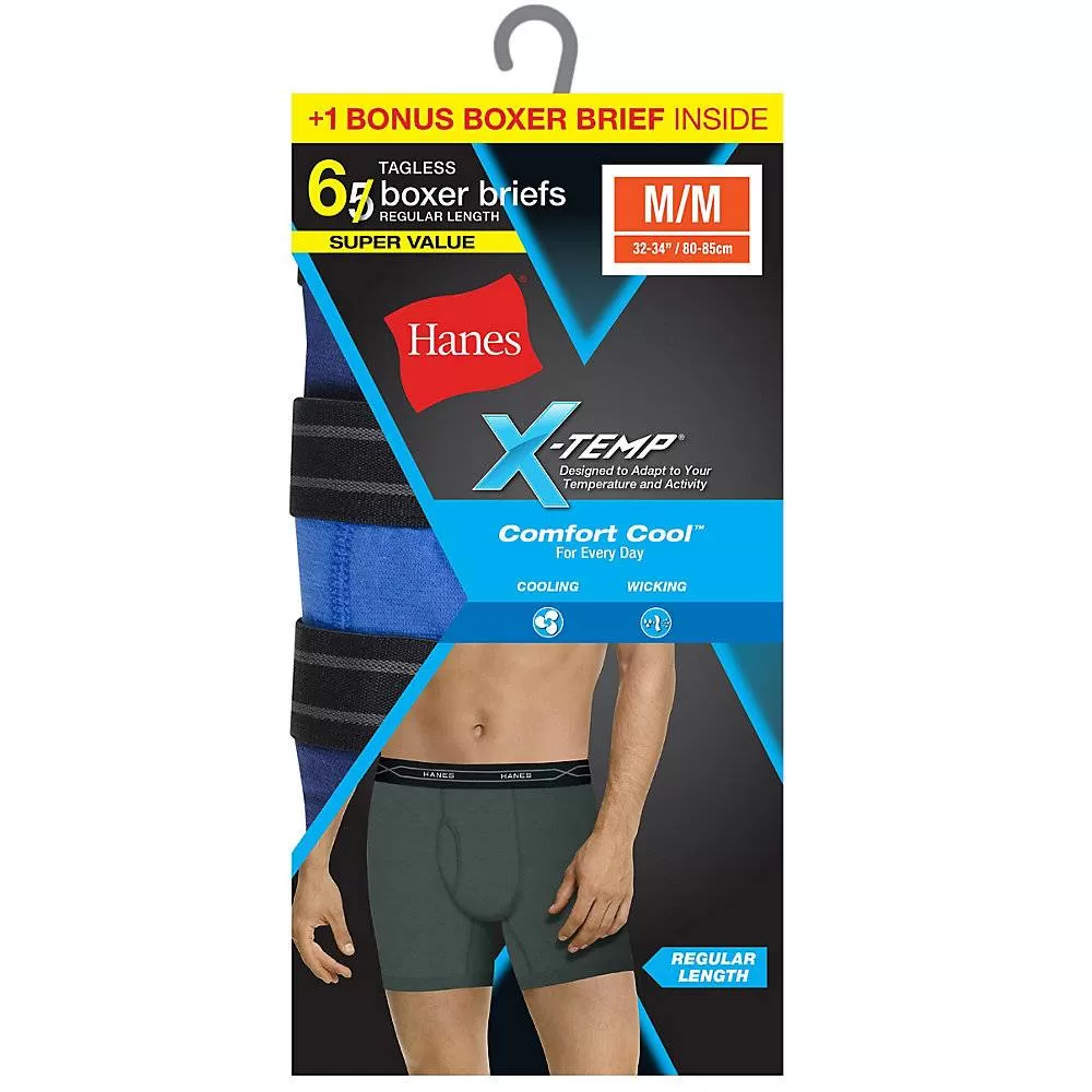 Information:X-Tempâ„¢ technology adapts to temperature, environment, and activity to keep you cool and dry for all day comfort.Quick-drying fabric wicks away moisture for added comfort.ComfortFlex® waistband is soft and stretchable.No ride up.Traditional fly.Tag-free for itch-free comfort.Convenient 6-Pack includes a bonus boxer brief.