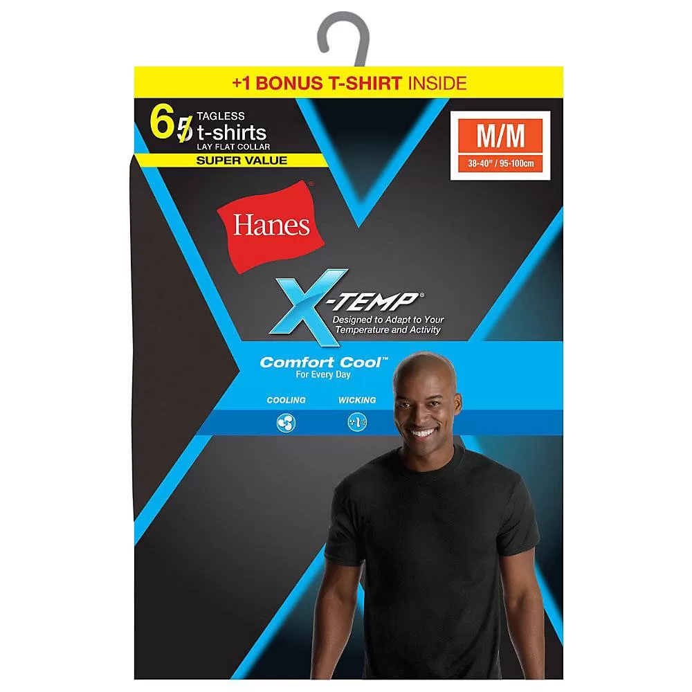 Information:Hanes Crew T-shirts with X-Tempâ„¢ technology adapts to temperature, environment, and activity to keep you cool and dry for all day comfort.Moisture-wicking technology keeps you cool and dry.Lay Flat collar keeps its shape wash after wash.Tag-free for itch-free comfort.Convenient 6-Pack includes a bonus crewneck.