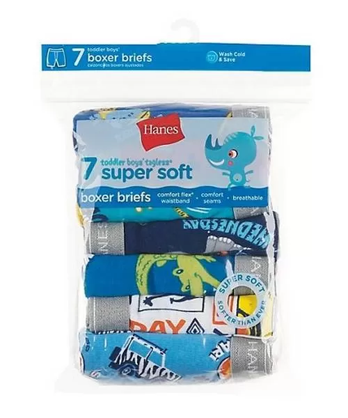 Information:Make going to the potty fun in these days of the week boxer briefs!Made with soft, breathable cotton.Comfort Flex® waistband for move-with-you comfort.Comfort seams for all day wear.Tag-free for itch free comfort.No ride up fit.Assorted prints available in a convenient 7-pack.