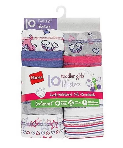 Information:All day comfort for her. Easy on the planet.At Hanesbrands, 25% of the energy used comes from renewable resources and more than 100 million pounds of production materials are recycled each year.Open packaging is recyclable.Made with a soft and breathable cotton-poly blend. No pinch, no roll superior comfort waistband. Hipster styling sits at the hip.Tag-free for added comfort.No ride up guaranteed.Smooth, non-binding leg bands for total comfort.Available in a convenient 10-Pack.