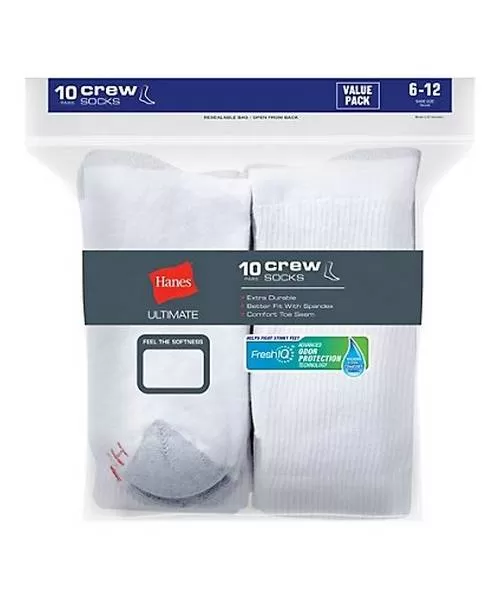 Information:Treat your feet to the ultimate in comfort, fit and performance.FreshIQ™ advanced odor protection technology attacks the odor-causing bacteria in your clothing that causes your underwear and socks to smell — so now you can feel fresh all day.Cushioned foot bottom puts comfort in every step.Grey durable sole. Wicking breathable Cool Comfort™ fabric keeps your feet cool and dry.Reinforced grey heel and toe.Crew length says up and hits at mid-calf.Comfort toe seaming, our most comfortable seam ever.Available in a convenient 10-pack.