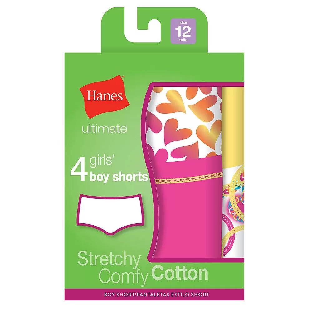 Short Description: Hanes Ultimate™ TAGLESS® Cotton Stretch Girls' Boy Shorts 4-Pack Style# GUCSP4 contain 4 per pack and fabric content; 97% Cotton/3% Polyester.