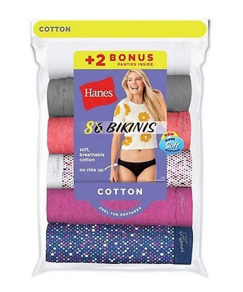 Information:Flatter your curves with the comfort and full coverage fit of these cotton briefs.Ultra soft waistband for unbelievable comfort.Cool Comfortâ„¢ wicking fabric keeps you cool for all day comfort.Bikini cut provides moderate coverage front and back with a lower waist and hi-cut legs. Soft, 100% cotton panty liner.Tag-free for added comfort.Convenient 8-pack includes 2 free bonus panties.