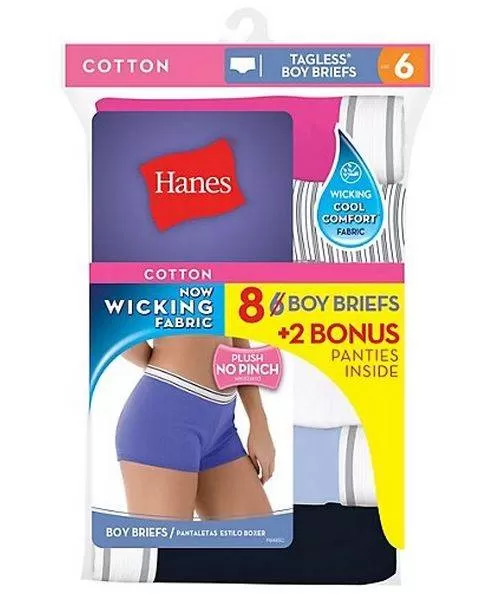 Information:In our Cool Comfort Boy Brief Panties you'll keep your cool no matter what the day brings.Super soft Cool Comfort fabric wicks away moisture to keep you cool and dry.Boy brief style provides full coverage front and back.Soft, breathable cotton comes preshrunk for a confident fit, wash after wash. Sporty waistband won't pinch or bind.Tag-free for itch-free comfort.Convenient assorted 8-pack includes 2 free bonus boy briefs.