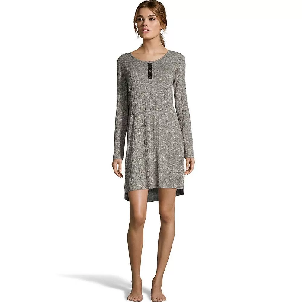 Information:Nothing says stay in and chill like our cozy rib sleepshirt. Long sleeve crewneck sleepshirt with contrast stretch lace decorative placket. Faux metal decorative buttons.Comfy rib knit fabric feels good against the skin. High/low hem with side slits for ease of movement.37 inch inseam.Tag-free for itch-free comfort.