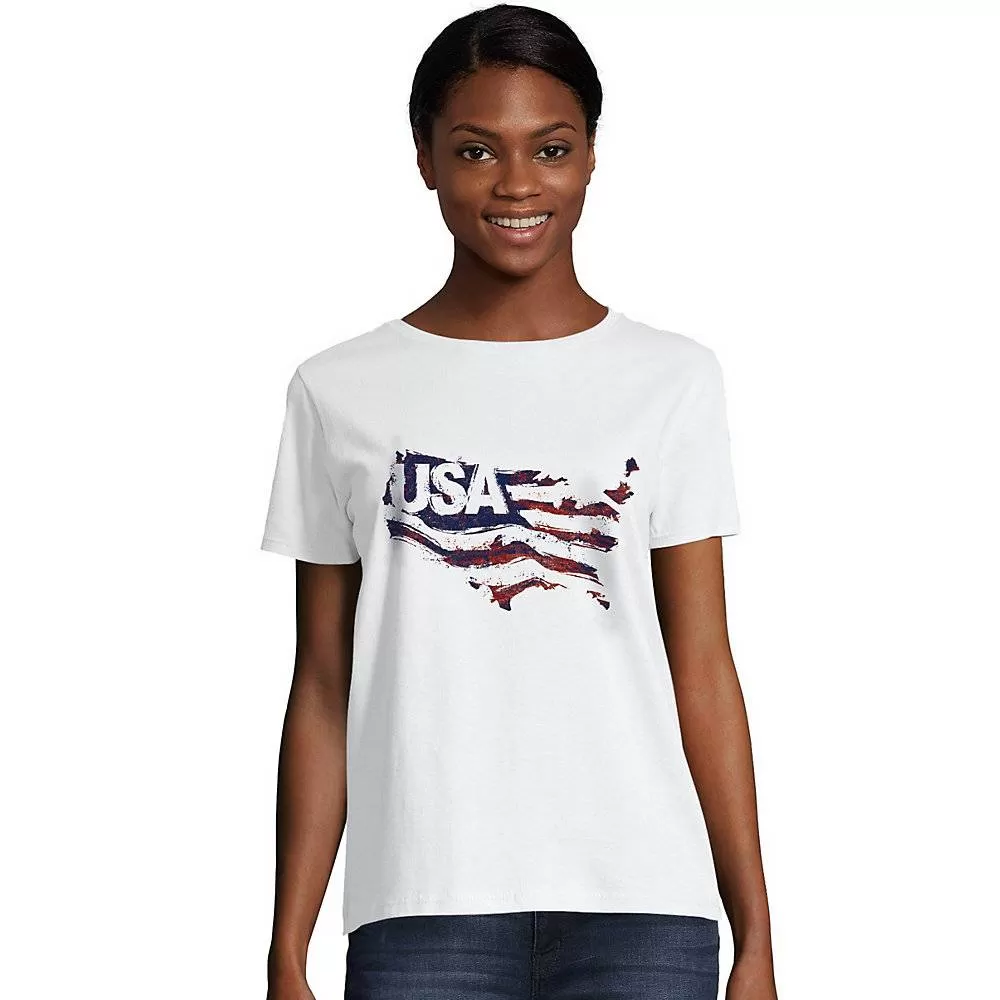 Information:Nothing says you're proud to be an American like this fun, graphic tee.Ultimate tee for comfort, and made just for a woman's shape.Soft, pure, breathable cotton knit.Relaxed fit, but never boxy.ComfortSoft® cotton is specially treated for incredible softness.Wash inside out if decorated. Do not iron graphic. Tumble dry low. Cool iron if needed.
