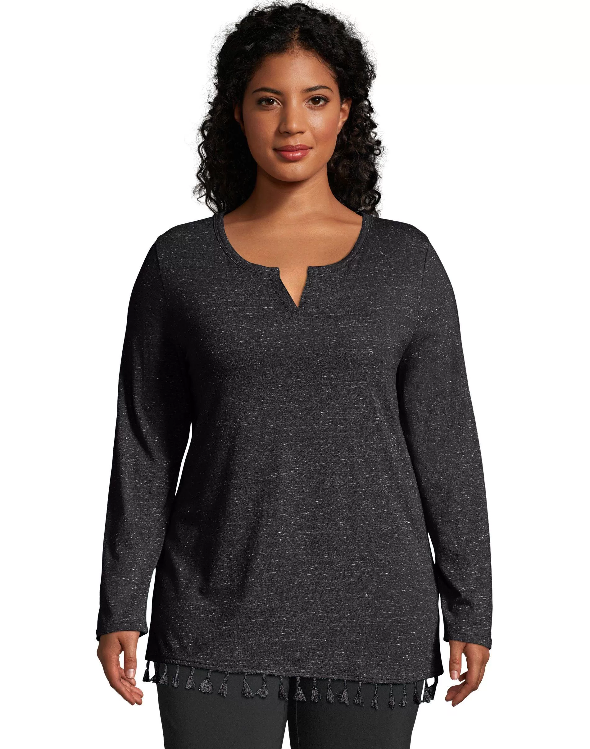 Information:The band of tassels around the hem of this top add a fun, novelty touchSoft, lightweight cotton blend long-sleeve top will be comfortable year-round.Dozens of inch-long tassels under the hem are super cute. Tag-free collar.Banded scoop neckline with cross-V open placket. Heathered fabric adds a textured look. 30-inch length.