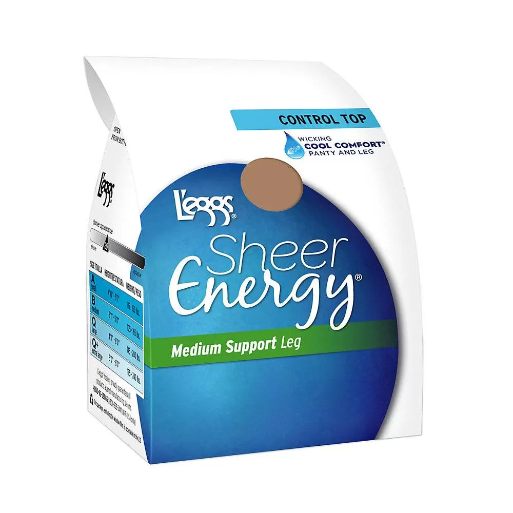 Information:Famous L'eggs Sheer Energy pantyhose fit like a second skin...feel like an all-day massage. Silky-sheer blend micro-tones legs for constant refreshing comfort. Sleek control top gently smooths tummy. Reinforced toe resists wear & tear.