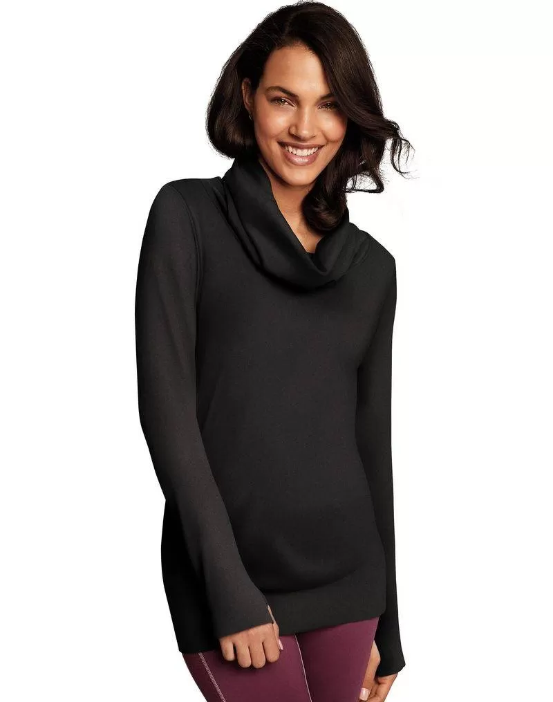 Information:Maidenform offers thermal baselayer tops & bottoms with the look of stylish outerwear.Wear baselayers alone or layer for warmth.Cowl Neck Tunic is warm and modern.Seamless fabric wicks moisture to keep you cool and comfortable.Flat seams for reduced chafing.Thumbholes help keep sleeves in place.Ribbed cuffs and waistband.Longer tunic length covers hips.