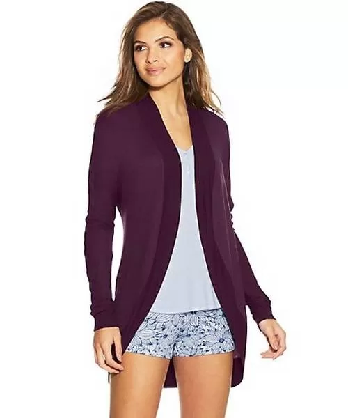 Information:Wear this cocoon wrap as a short robe or as a jacket over sleep or loungewear. Open front sweater-style design. Long sleeves with ribbed cuffs. Shawl collar with a wide band of contrast ribbing. Light, soft, ribbed fabric with a hint of stretch for tossing and turning. Hi-lo hem curves in back. Vertical center back seam.