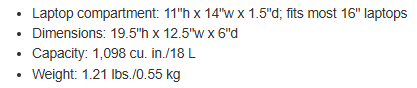 Information:Durable yet pliable, each Claremont bag is made to meet the many needs of the hybrid lifestyle head-on. It features sleek, modern details for an overall clean and elevated aesthetic. Fabric+Construction 65/35 polyester/cotton Features+Benefits Spacious main compartment Hidden zipper compartment Expandable side pocket Wrapped matte zipper pulls Matte dyed-to-match coated zipper tape Weight+Measurements Laptop compartment: 11'h x 14'w x 1.5'd; fits most 16' laptops Dimensions: 19.5'h x 12.5'w x 6'd Capacity: 1,098 cu. in./18 L Weight: 1.21 lbs./0.55 kg Note: Bags not intended for use by children 12 and under.