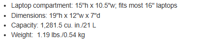 Information:A versatile, functional pack with trend-conscious styling. A zippered front pocket provides full access to the entire face of the pack for easy decoration. Fabric+Construction 900D dry-handed ballistic polyester Features+Benefits Zippered main compartment with padded laptop compartment Interior zippered mesh pocket Zippered front pocket Mesh side pockets Web carry handle Padded, adjustable shoulder straps Back trolley pass through Matte zipper pulls Weight+Measurements Laptop compartment: 15'h x 10.5'w; fits most 16' laptops Dimensions: 19'h x 12'w x 7'd Capacity: 1,281.5 cu. in./21 L Weight: 1.19 lbs./0.54 kg Note: Bags not intended for use by children 12 and under
