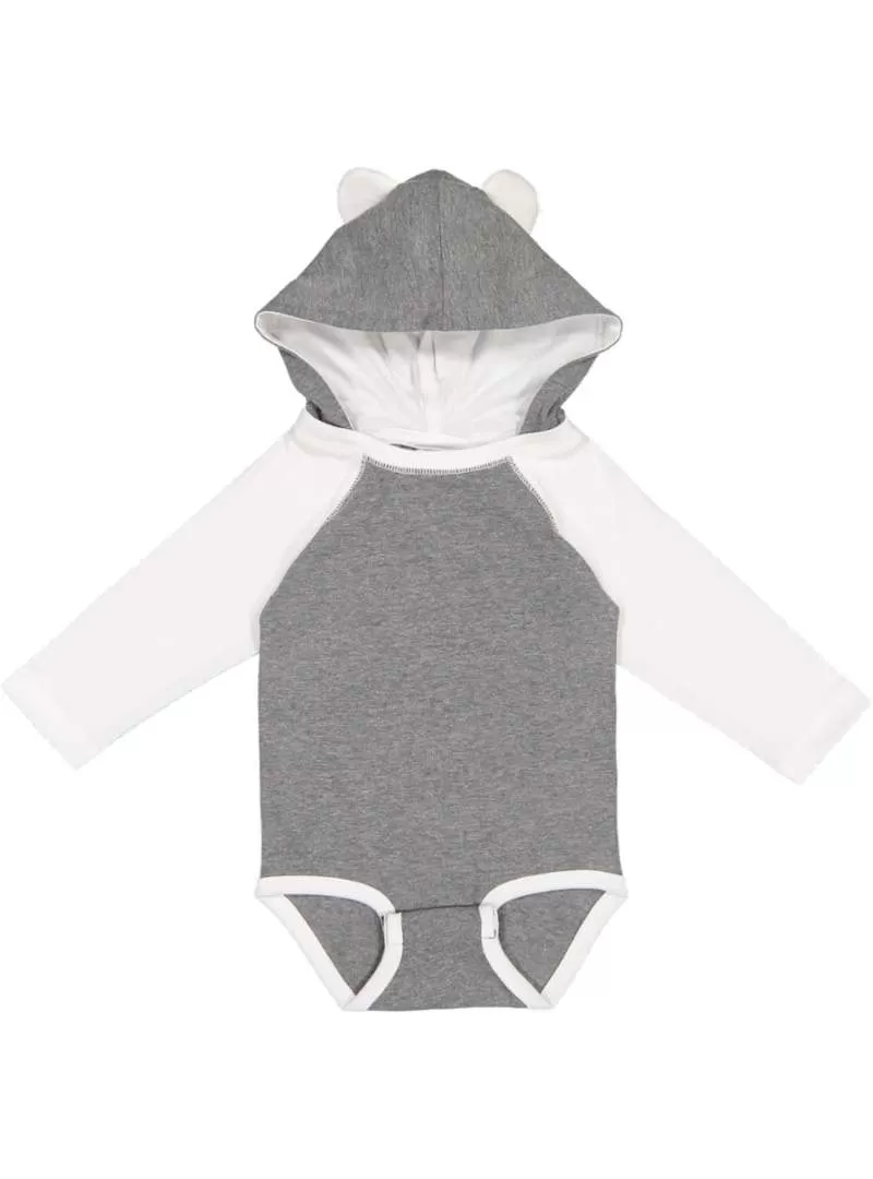 The character hood bodysuit is a fun, playful option for any little one. Available in three colorways, this style has color blocked raglan sleeves as well as a contrast hood lining and ears. This is a fun style for play or every day.